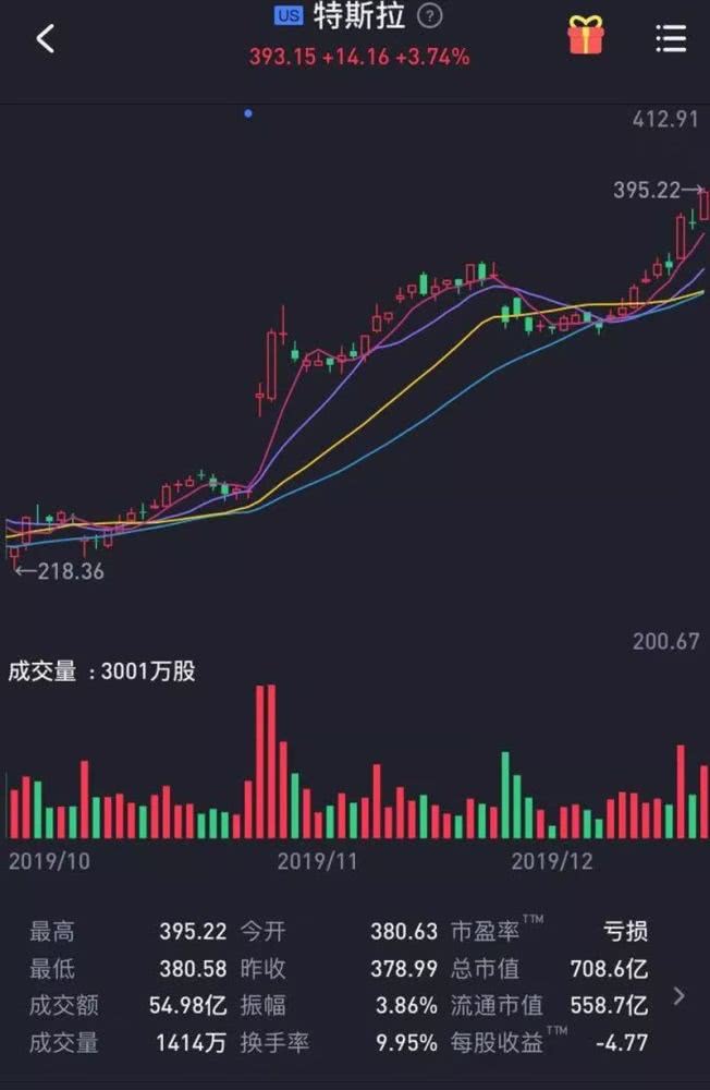 美东时间周三收盘,特斯拉股价刷新历史高位,报393.15美元,逼近400美元关口,突破两年前创下的收盘高位纪录,市值更是超过700亿美元。
