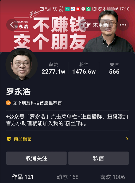 那么,这家名不见经传的直播公司又是如何与罗永浩搭上关系的?在星空野望成立一周后,其即全资设立了一家名为“成都交个朋友科技有限公司”的公司,而罗永浩目前抖音账号的认证内容则为“交个朋友科技首席推荐官”。