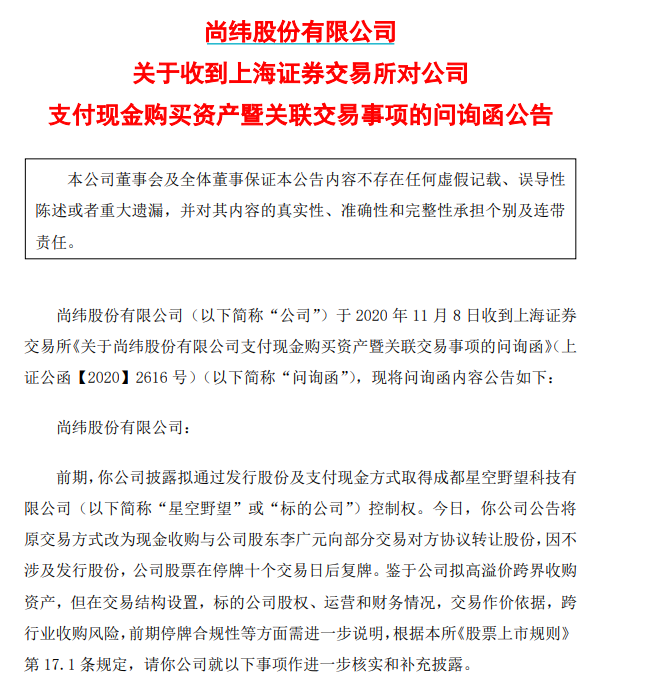 此外,上交所还要求说明,尚纬股份由采用发行股份购买资产转为现金收购星空野望股权、李广元转让所持公司股份互为前提的一揽子交易的具体考虑,是否与交易主体间的利益安排相关,是否有损公司及中小投资者利益。