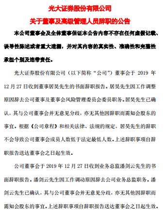 12月27日晚间,光大证券发布《光大证券股份有限公司关于董事及高级管理人员辞职的公告》,公告显示居昊因工作调整原因辞去公司董事及董事会风险管理委员会委员职务。潘剑云因工作调动原因辞去公司业务总监职务。光大证券对居昊及潘剑云在任职期间为公司发展做出的贡献表示衷心感谢。