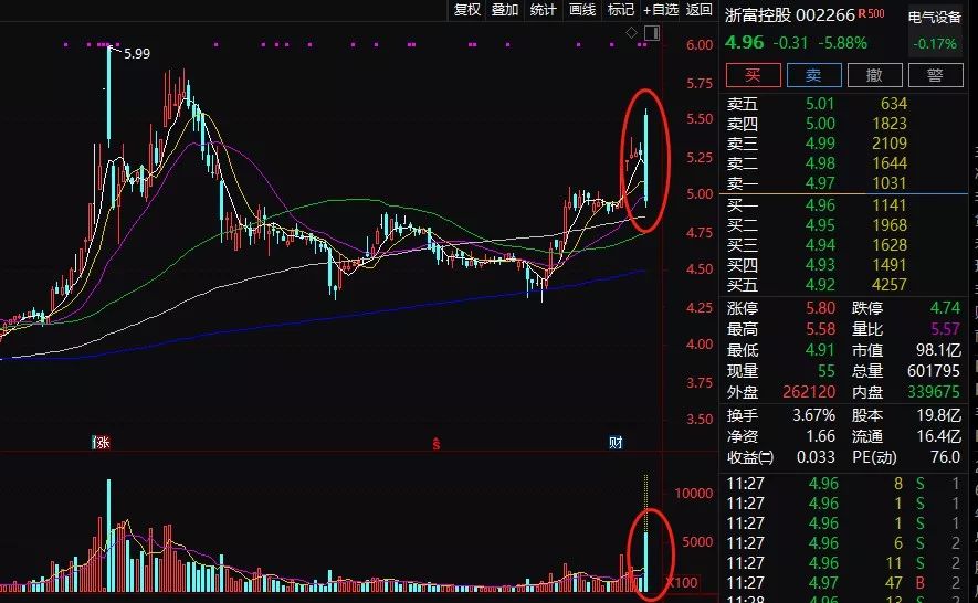 受利好消息刺激,浙富控股股价今日大涨4.93%开盘,然而开盘涨幅只是瞬间,开盘后股价快速跌落,截至上午收盘下跌5.88%,位居两市跌幅前列。