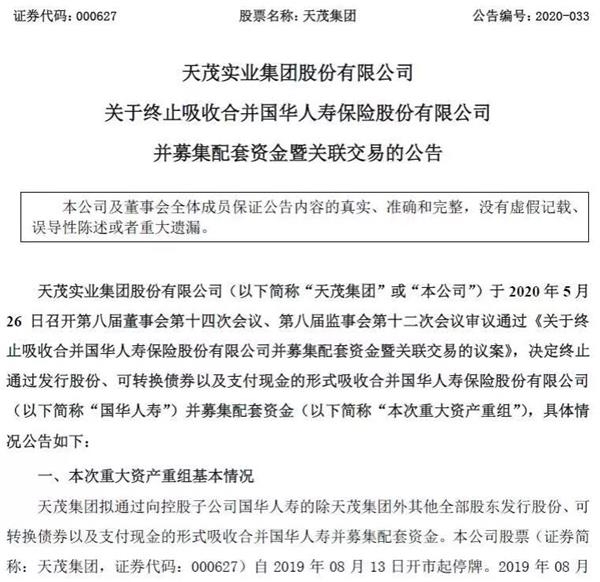 2019年8月20日,天茂披露了《天茂实业集团股份有限公司关于筹划发行股份购买资产事项暨关联交易的停牌进展公告》,8月26日晚正式公布了吸收合并国华人寿交易预案。