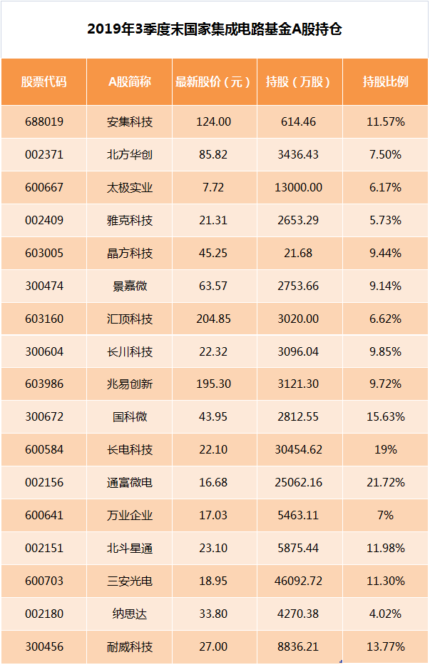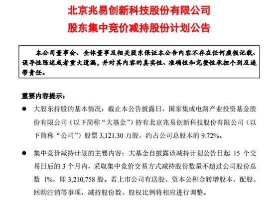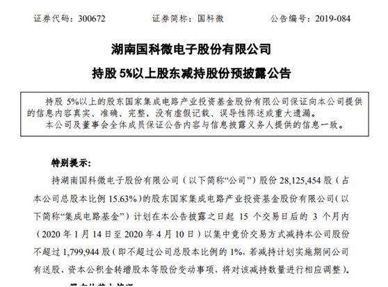 本次减持前,国家大基金持有国科微2812.55万股股份,占国科微总股本的15.63%;持有汇顶科技3020万股,约占汇顶科技总股本的6.62%;持有兆易创新股票3121.30万股,约占兆易创新总股本的9.72%。