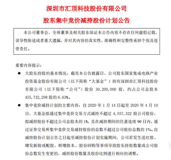 今日晚间,三家科技股遭减持的公告受到市场关注,兆易创新、国科微、汇顶科技三家上市公司分别发布公告称,国家集成电路产业投资基金计划15个交易日后的3个月内减持各自不超过总股本1%的公司股份。据了解,在今日(12月20日)之前,该基金从未进行过减持。