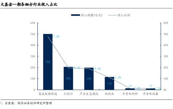 国信证券研究报告显示,截至2018年年底,大基金一期投资基本完毕,根据公开信息投资总金额约1047亿。在各领域投资的规模和所占比例大概为:IC 设计(205.90 亿元,占比 19.7%);集成电路制造(500.14 亿元,占比 47.8%);封测业(约115.52亿元,占比为11.0%);半导体材料(约14.15亿元,占比为1.4%);半导体设备(12.98亿元,占比为1.2%)、产业生态建设(约198.58亿元,占比为19.0%)。