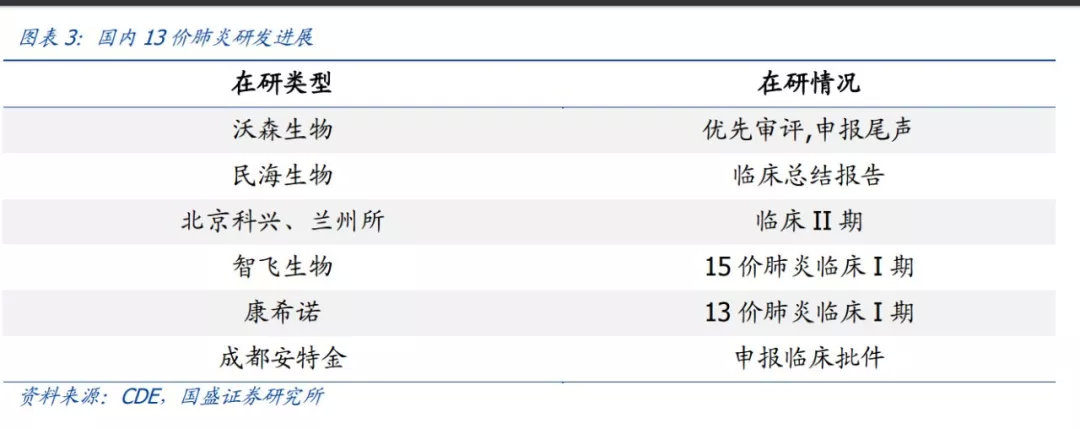 目前,国内除了沃森生物之外,还有包括民海生物、北京科兴、兰州所、智飞生物、康希诺以及成都安特金等在做13价肺炎疫苗的研发。从研发进展来看,民海生物13价肺炎疫苗处于临床总结报告阶段;北京科兴和兰州所该疫苗处于临床II期阶段;智飞生物处于15价肺炎临床I期阶段;康希诺处于13价肺炎临床I期阶段;成都安特金处于申报临床批件阶段。