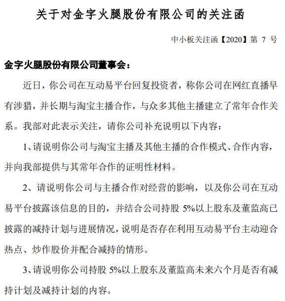 当日稍晚时候,深交所向金字火腿下发关注函,要求公司说明与淘宝主播及其他主播的合作模式、合作内容,并提供常年合作的证明材料;在互动易平台披露该信息的目的,并结合股东减持计划及进展,说明是否存在利用互动易平台主动迎合热点、炒作股价并配合减持的情形。