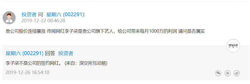 此前星期六曾在深交所互动平台上回应投资者提问称,李子柒不是公司签约网红。