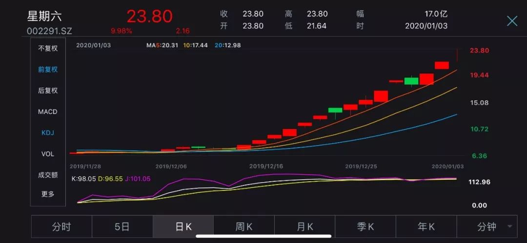 本周五(1月3日),上市公司星期六(002291)再次涨停,连续15个交易日已出现12个涨停。去年12月初至今,公司股价从6块多一路蹿到近24元!