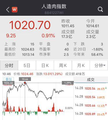 另外,人造肉指数自10月8日以来连续上涨,截至发稿,报1020.70元,上涨0.91%。