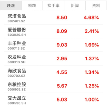 其中,双塔食品领涨,涨幅为4.68%,报8.5元;爱普股份(8.090,0.19, 2.41%)涨幅靠前,涨2.41%,报8.09元。