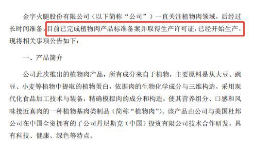 10月14日,金字火腿(002515.SZ)发布公告称,公司已完成植物肉产品标准备案并取得生产许可证,已经开始生产。