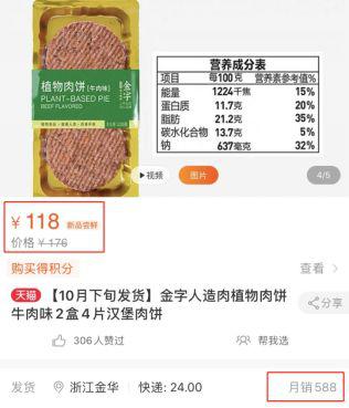 目前,金字火腿生产的人造肉产品目前已在其天猫旗舰店预售,并显示将于10月下旬发货,淘宝网显示该产品220g售价为118元,已有588人付款,库存达351件。产品介绍栏显示,上述人造肉饼以大豆等植物蛋白制成,有牛肉质感和口感,被定位为健身达人、素食主义、养生人群的轻食好伴侣。金字火腿因此成为国内首家真正上市销售人造肉的公司。