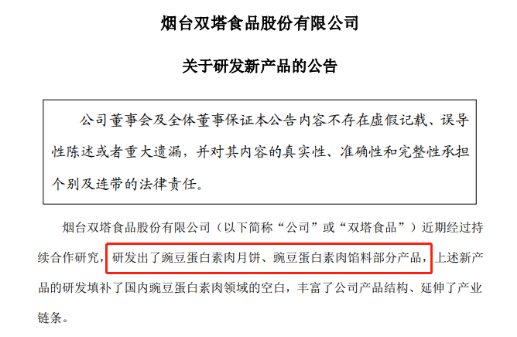 9月4日,食品概念股上市公司双塔食品发布新产品公告,公告显示近期公司近期经过持续合作研究,研发出了豌豆蛋白素肉月饼、豌豆蛋白素肉馅料部分产品,该类产品主要以豌豆组织蛋白、豌豆拉丝蛋白为原料,具有高保水性、高弹性、高组织化等特性,同时具有无常见过敏原、无转基因、无胆固醇、不含抗生素等显著特点。