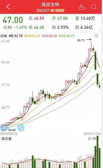 大牛股我武生物昨日继续下跌,收盘报47元,跌幅1.67%。这是该股连续第4天下跌,累计跌幅接近20%,市值从300多亿元缩水至最新的不足250亿元。在下跌过程中,整体呈现出机构出逃,北上资金大举加仓的局面。