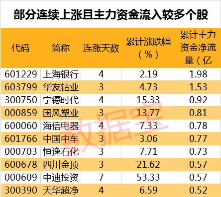 值得注意的是,141只连续上涨个股中,11只个股期间主力资金累计净流入超过5000万元。其中,累计资金流入最多的为上海银行,主力资金累计流入1.98亿元。