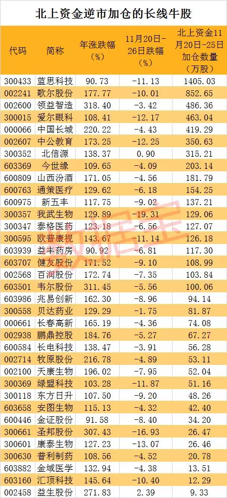 与此同时,北上资金却在增持。比如蓝思科技11月22日跌停,北上资金增持741万股,11月25日大跌日北上资金再度增持754万股;中公教育11月22日大跌9.61%,北上资金加仓94万股,11月25日下跌5.42%,北上资金增持286万股。