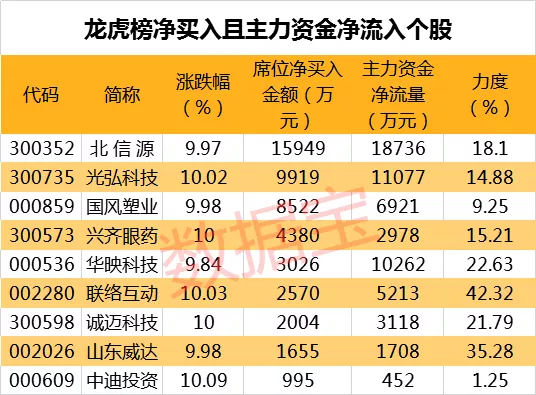 从盘口资金流向来看,主力资金净流入超千万且龙虎榜净买入个股共有10只,其中北信源、光弘科技、华映科技等个股资金净流入金额最大。净流入力度最大的个股有联络互动、山东威达、华映科技,净流入力度分别为42.32%、35.28%、22.63%。
