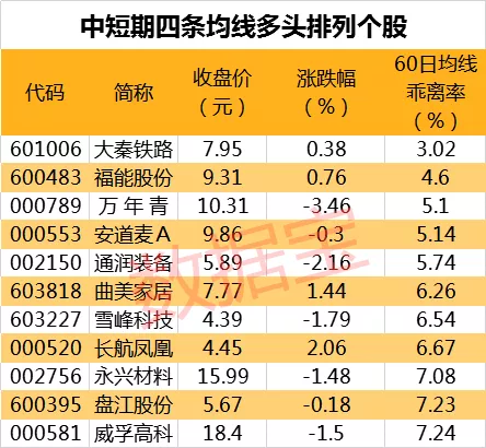 截至最新,79只个股5日、10日、20日、60日四条均线近日呈多头排列。其中大秦铁路、福能股份、万年青股价与60日均线的乖离率最小,分别为3.02%、4.60%、5.10%。