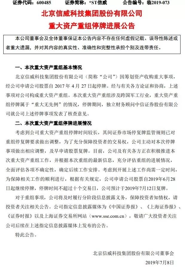 在经历近两年半时间超长时间停牌之后,*ST信威终于要复牌了。7月7日傍晚,该公司发布公告称,将于7月12日复牌(也就是本周五)。