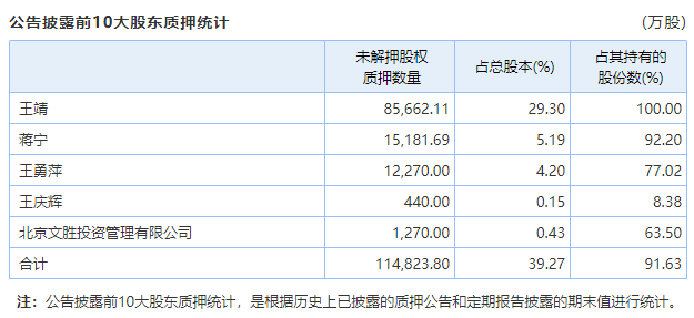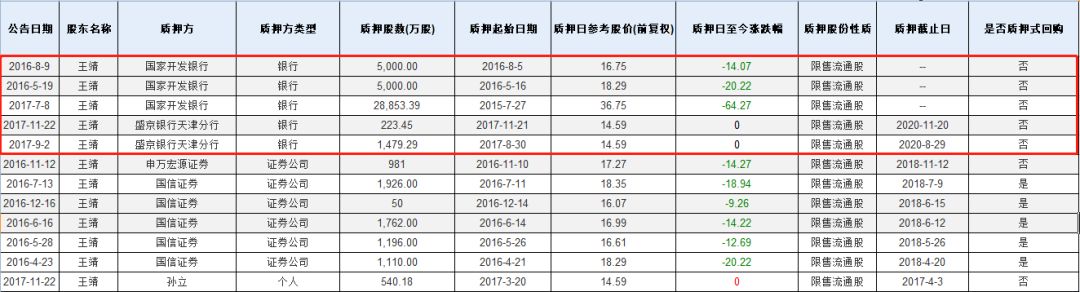 由于有些股权质押是反复操作,所以目前并未统计出详细数据。从wind的数据来看,在王靖仍处于质押期的股票中,主要的质押方是国家开发银行和盛京银行。