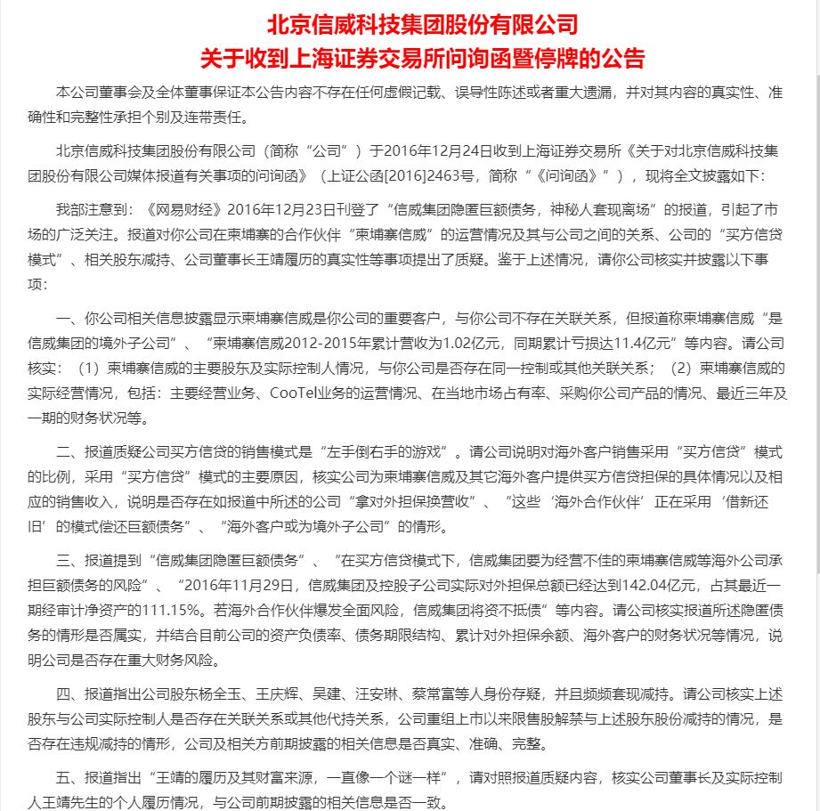 关于信威集团的财务谜团、盈利模式,上交所在2016年底曾做过专业问询。