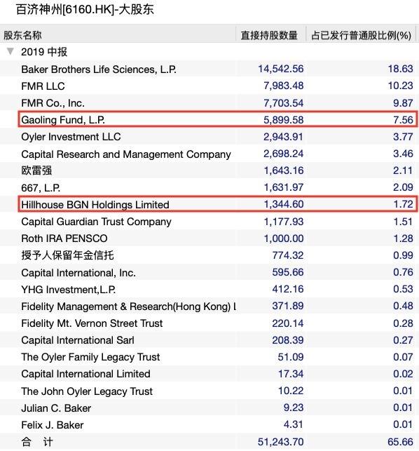 数据显示,从2016年美股上市后至今,高瓴资本一直是百济神州持股5%以上的大股东。2019年中报显示,高瓴资本两个主体合计持有百济神州约7244万股,持股比例合计约9.28%。