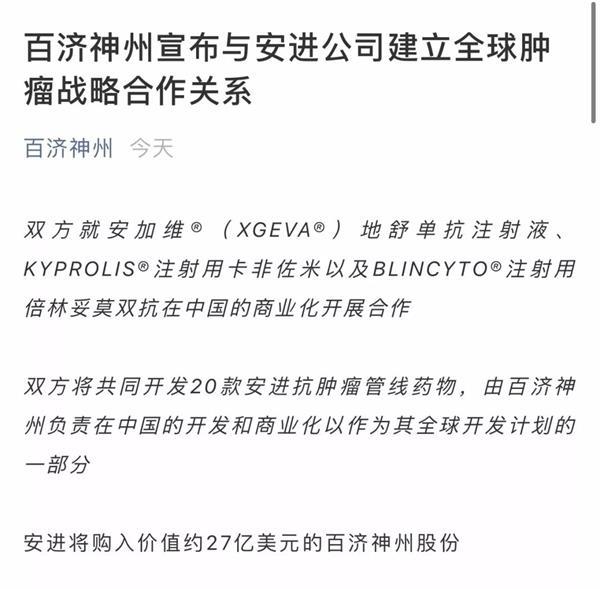 除了股权收购,安进与百济神州此次还达成了全球肿瘤战略合作关系,将合作进行产品在中国的商业化以及管线产品的临床开发。