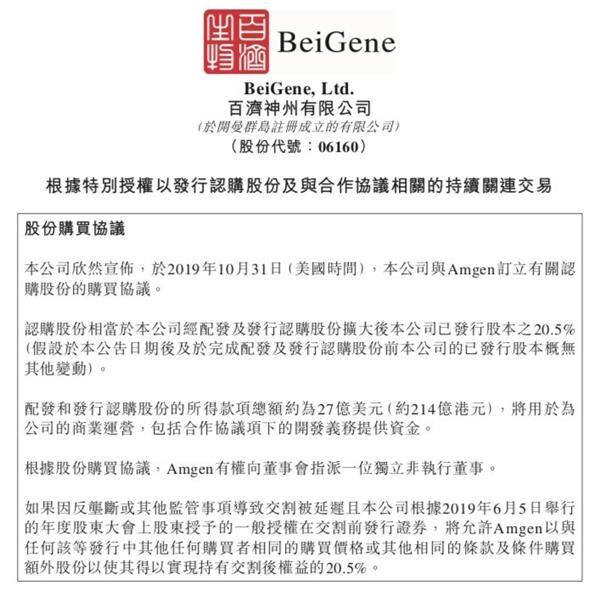 根据今日公告,百济神州已与美国药企巨头安进(Amgen)签订了股份认购协议,后者将斥资27亿美元(约214亿港元)购入百济神州20.5%股权。