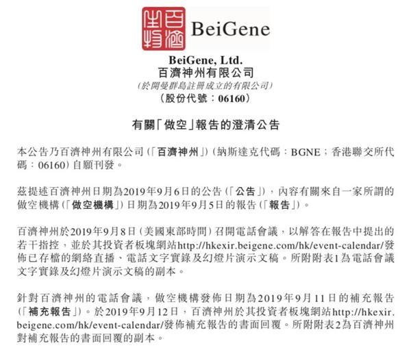 9月6日,百济神州发布公告,斥责做空报告失实、毫无依据且具误导性指控,旨在对百济神州股价造成负面影响,从而满足做空机构私利,直指“报告中的指控为公然造假”。