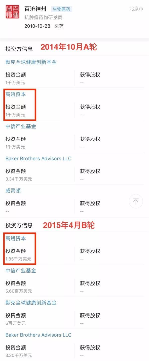 2014年10月和2015年4月,百济神州先后获得7500万美元、9700万美元的两轮融资。清科私募通数据显示,高瓴资本在A股融资中投资1000万美元,在B轮融资中投资1850完美元。