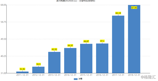 值得注意的是,一直以来冰箱业务可谓是奥马电器的“利润奶牛”,从2013年至2018年,其冰箱板块的收入一直处于逐年攀升的状态,分别是42.52亿元、44.57亿元、46.87亿元、47.1亿元、62.19亿元和67.95亿元。甚至,在2018年奥马电器巨亏19亿元的情况下,奥马冰箱仍然实现净利润3.32亿元。