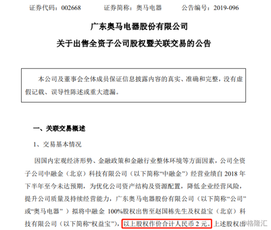 具体而言,据公告显示,因国内宏观经济形势、金融政策和金融行业整体环境等方面因素,奥马电器全资子公司中融金(北京)科技有限公司经营业绩自2018年下半年至今未达预期,为优化公司资产结构及资源配置,降低企业经营风险,提升公司质量及持续经营能力,公司拟将中融金100%股权出售至赵国栋及权益宝(北京)科技有限公司(“权益宝”),以上股权作价合计人民币2元。