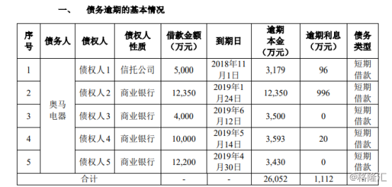 除此之外,今年6月份,奥马电器还发布公告称,公司因资金紧张出现部分债务逾期情况,而经财务部门统计核实,截至2019年6月12日,公司逾期债务合计约2.72亿元,占公司最近一期经审计净资产的11.57%。