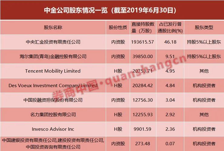 此后,中金公司股权历经多次重大转折,母公司也最终变更为中央汇金,被纳入“中投大家庭”,摩根士丹利则在2010年退出全部股权。在多个战略投资者陆续加盟后,截至2019年6月30日,中金公司前三位大股东分别为中央汇金(持股46.18%)、海尔金控(9.51%)、腾讯控股(4.95%),第四、第五大股东则分别为阿里巴巴(4.84%)和中投保公司(3.04%)。