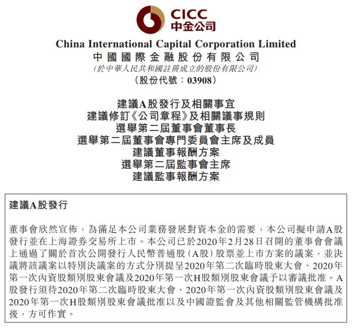 2月28日晚间,中金公司发布一系列董事会议案,首当其冲的即是“建议A股发行及相关事宜”的议案。中金公司董事会宣布,为满足其业务发展对资本金的需要,拟申请A股发行并在上海证券交易所上市。