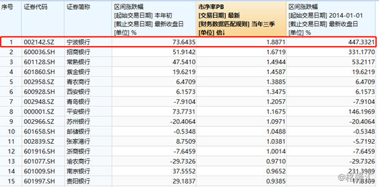 今年以来,平安银行、宁波银行、招商银行位居36家银行涨幅前三强,分别上涨73.77%、73.64%、51.91%。如果从2014年初统计至今,三家银行分别上涨146%、447%、331%。