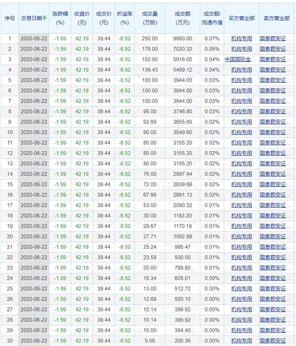 中兴通讯6月22日大宗交易平台共发生30笔成交,合计成交量2036.68万股,成交金额8.03亿元。成交价格均为39.44元,相对收盘价折价6.52%。从参与大宗交易营业部来看,机构专用席位共出现在29笔成交的买方或卖方营业部中,合计成交金额为7.44亿元,净买入7.44亿元。