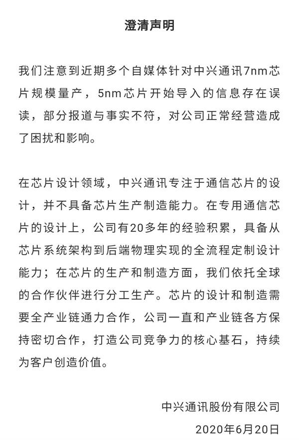 中兴通讯称,我们注意到近期多个自媒体针对中兴通讯7nm芯片规模量产,5nm芯片开始导入的信息存在误读,部分报导与事实不符,对公司正常经营造成了困扰和影响。在芯片设计领域,中兴通讯专注于通信芯片的设计,并不具备芯片生产制造能力。