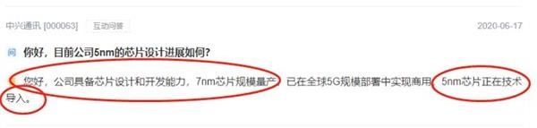 6月17日,中兴通讯在互动平台表示,公司具备芯片设计和开发能力,7nm芯片规模量产,已在全球5G规模部署中实现商用,5nm芯片正在技术导入。