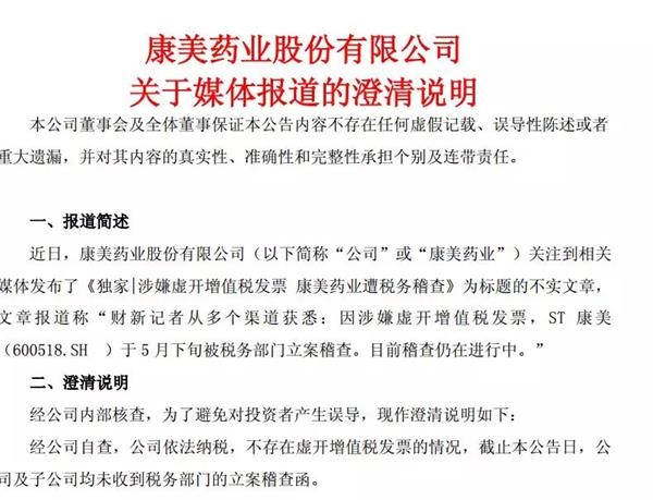 5月30日,ST康美发布澄清说明称,近日,公司关注到相关媒体发布了《独家|涉嫌虚开增值税发票康美药业遭税务稽查》为标题的不实文章。经公司自查,公司依法纳税,不存在虚开增值税发票的情况,截止本公告日,公司及子公司均未收到税务部门的立案稽查函。