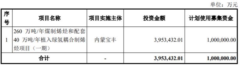 宝丰能源拟定增募资不超过100亿元,扣除发行费用后用于全资子公司内蒙古宝丰投建“260万吨/年煤制烯烃和配套40万吨/年植入绿氢耦合制烯烃项目(一期)”(下称“项目一期”)。