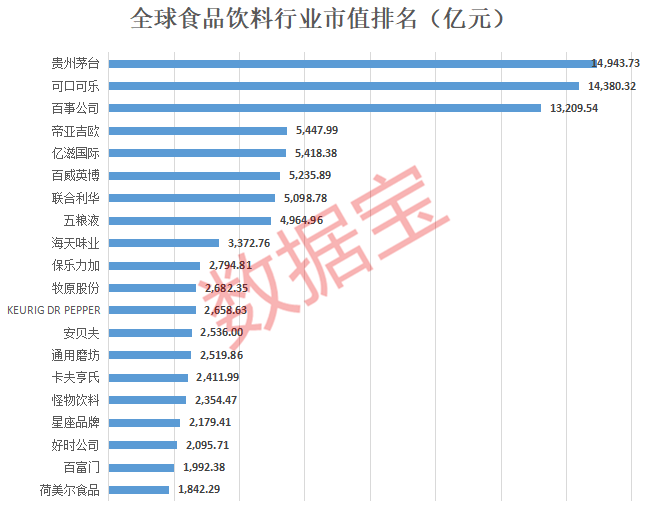 数据宝统计了全球主要股市属于Wind食品、饮料及烟酒行业的公司最新市值情况,剔除烟草公司后,除了贵州茅台外,五粮液以4965亿元市值位居全球第八位,海天味业市值3373亿元位居全球第九位。