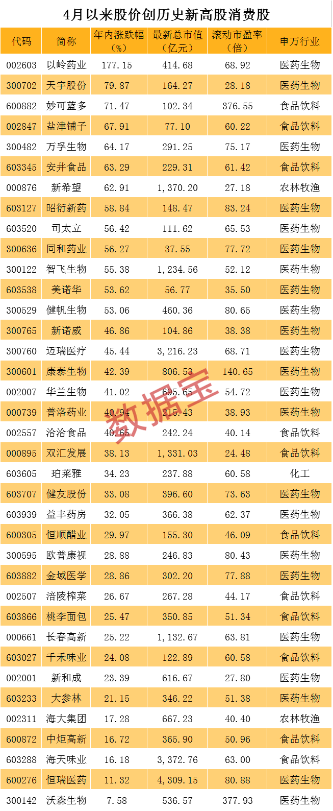 一大批大消费板块股票今年创出历史新高。数据宝统计显示,剔除次新股后,有40多只消费股4月以来股价创出历史新高。医药生物、食品饮料成为创新高个股集中营,分别贡献23只个股和11只个股。医药股中的以岭药业涨幅超过177%领涨医药生物股,妙可蓝多涨超71%领涨食品饮料股。