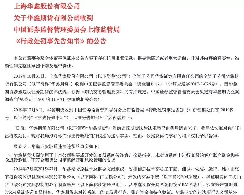 12月9日晚间,华鑫股份公告,旗下全资子公司华鑫期货因涉嫌违反证券期货法律法规,被上海证监局给予警告,没收违法所得1008.91万元,并罚款1008.91万元;同时相关责任人被警告或罚款。