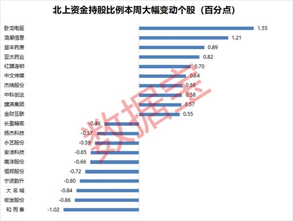 整体来看,北上资金增仓股共730只,增仓比例超0.5个百分点的有24只。具体来看,卧龙电驱增仓比例最为明显,最新持股比例2.39%,环比增加1.55个百分点;其次是浪潮信息,持股比例环比增加1.21个百分点;其他增仓比例靠前的还有益丰药房、亚太药业等。