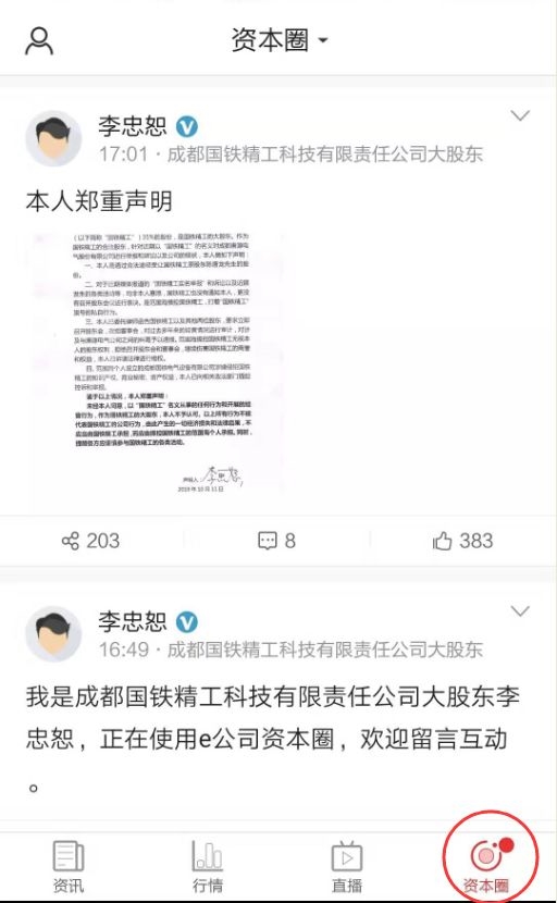 近4个月后,李忠恕于10月11日通过e公司·资本圈发布《声明》,其本人通过合法受让获得国铁精工35%的股份,已是国铁精工的大股东。李忠恕作为国铁精工的合法股东,针对近期以“国铁精工”的名义对唐源电气(300789)进行举报和诉讼以及该公司的现状做出四点声明,对国铁精工范国海反戈一击。