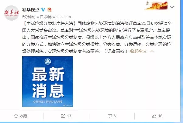 消息面上,据新华视点报道,生活垃圾分类制度将入法。固体废物污染环境防治法修订草案25日初次提请全国人大常委会审议。草案对“生活垃圾污染环境的防治”进行了专章规定。草案提出,国家推行生活垃圾分类制度。县级以上地方人民政府应当采取符合本地实际的分类方式,加快建立生活垃圾分类投放、分类收集、分类运输、分类处理的垃圾处理系统,实现垃圾分类制度有效覆盖。