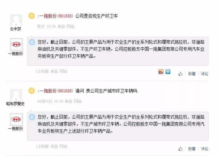 此后,不断有投资者在互动平台咨询,公司是否现生产环卫车、垃圾处理车等。一拖股份没有对此及时回复,但投资者似乎已经将这家拖拉机厂默认为“垃圾概念股”。