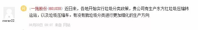 6月20日,有投资者在互动平台咨询一拖股份:近日来,各地开始实行垃圾分类政策,贵公司有生产东方红垃圾压缩转运站,以及垃圾压缩车。有没有就垃圾分类进行更加细化的生产方向?
